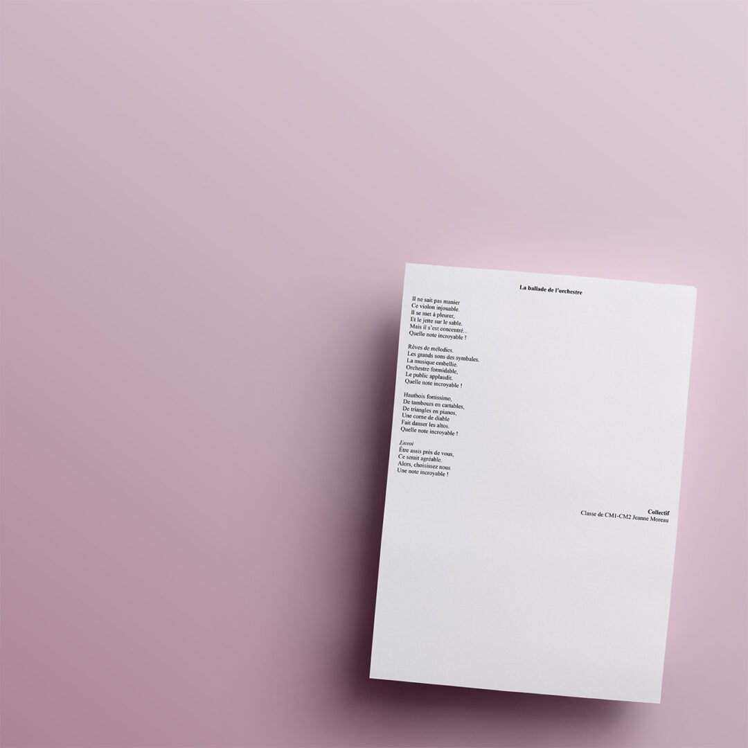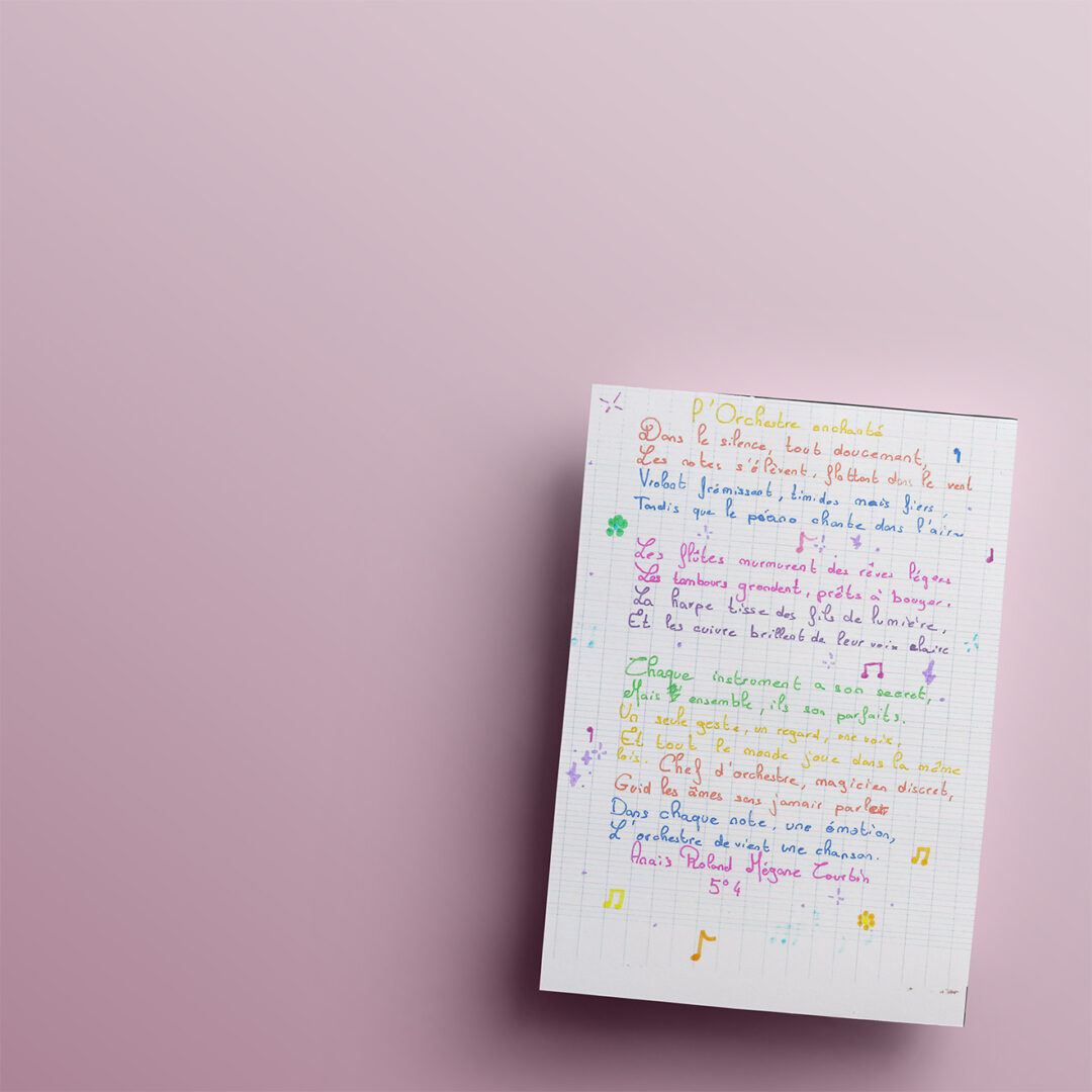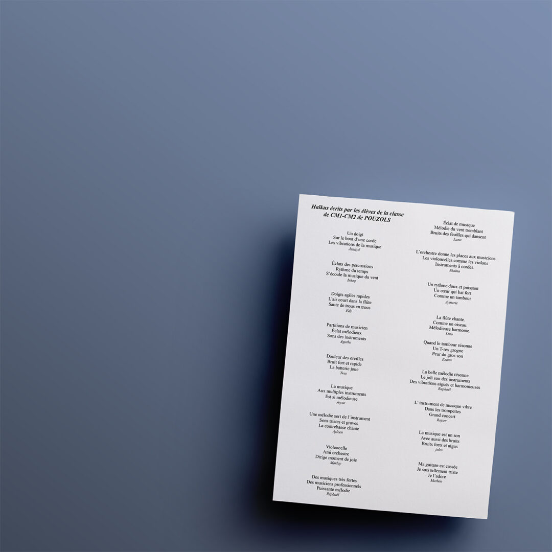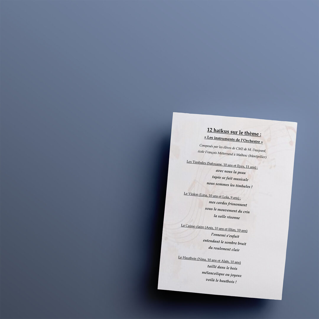 Dans le cadre du développement culturel et artistique, des élèves des écoles de Montpellier et des alentours ont été invités à écrire des poèmes (haïkus, sonnets, textes en prose, etc.) sur le thème de l’orchestre et des instruments. Découvrez ci-dessous leurs créations !